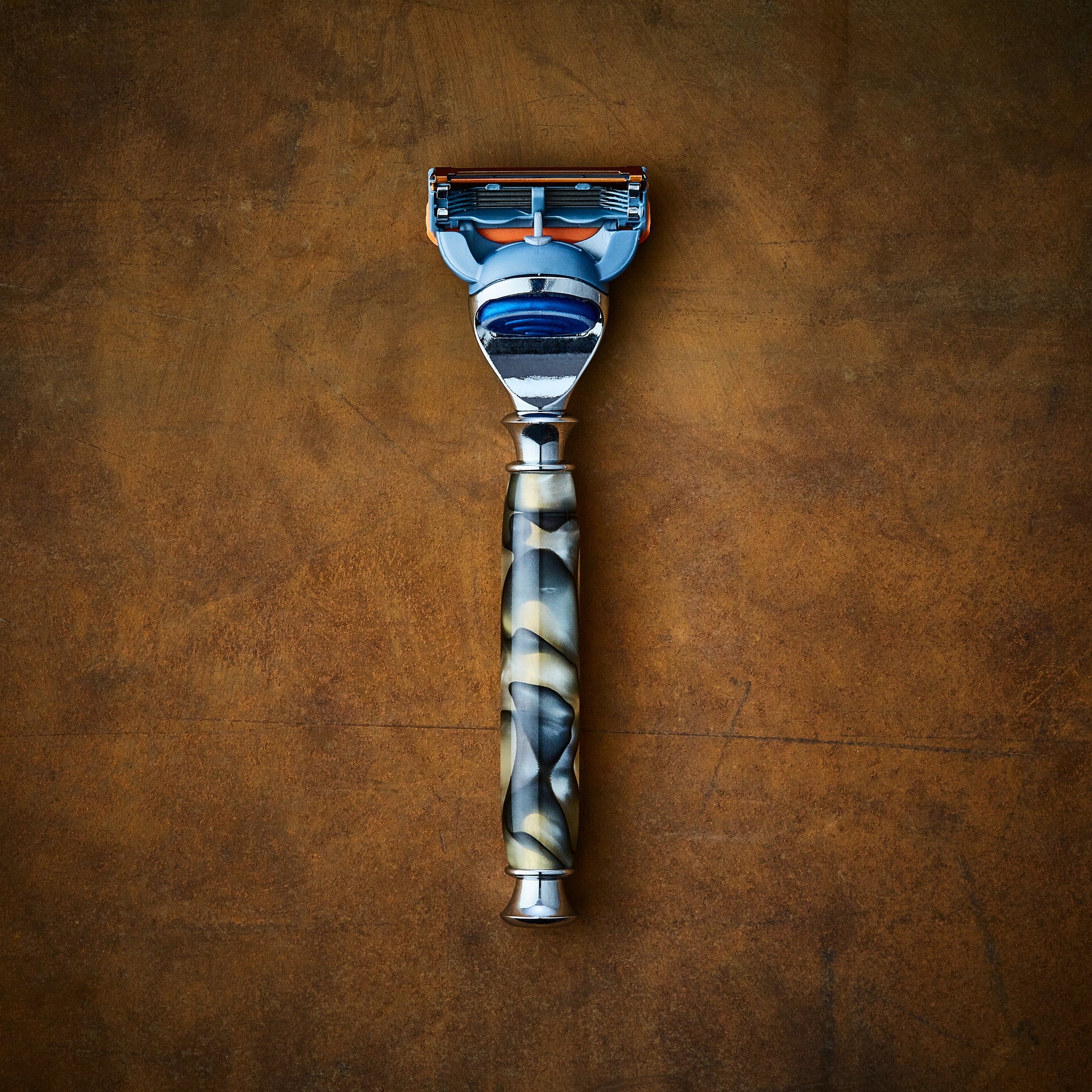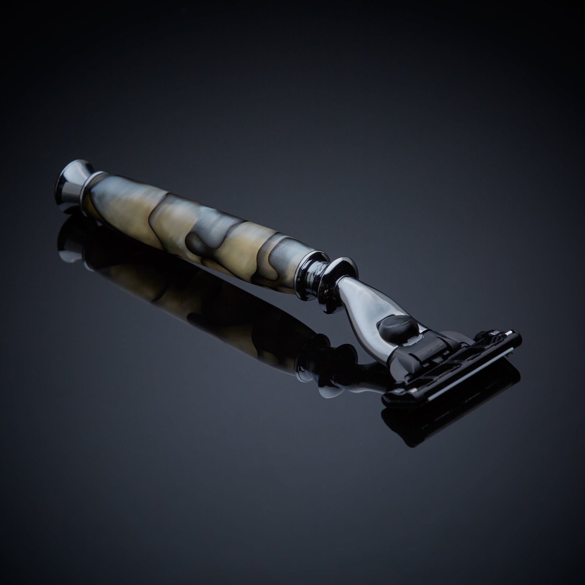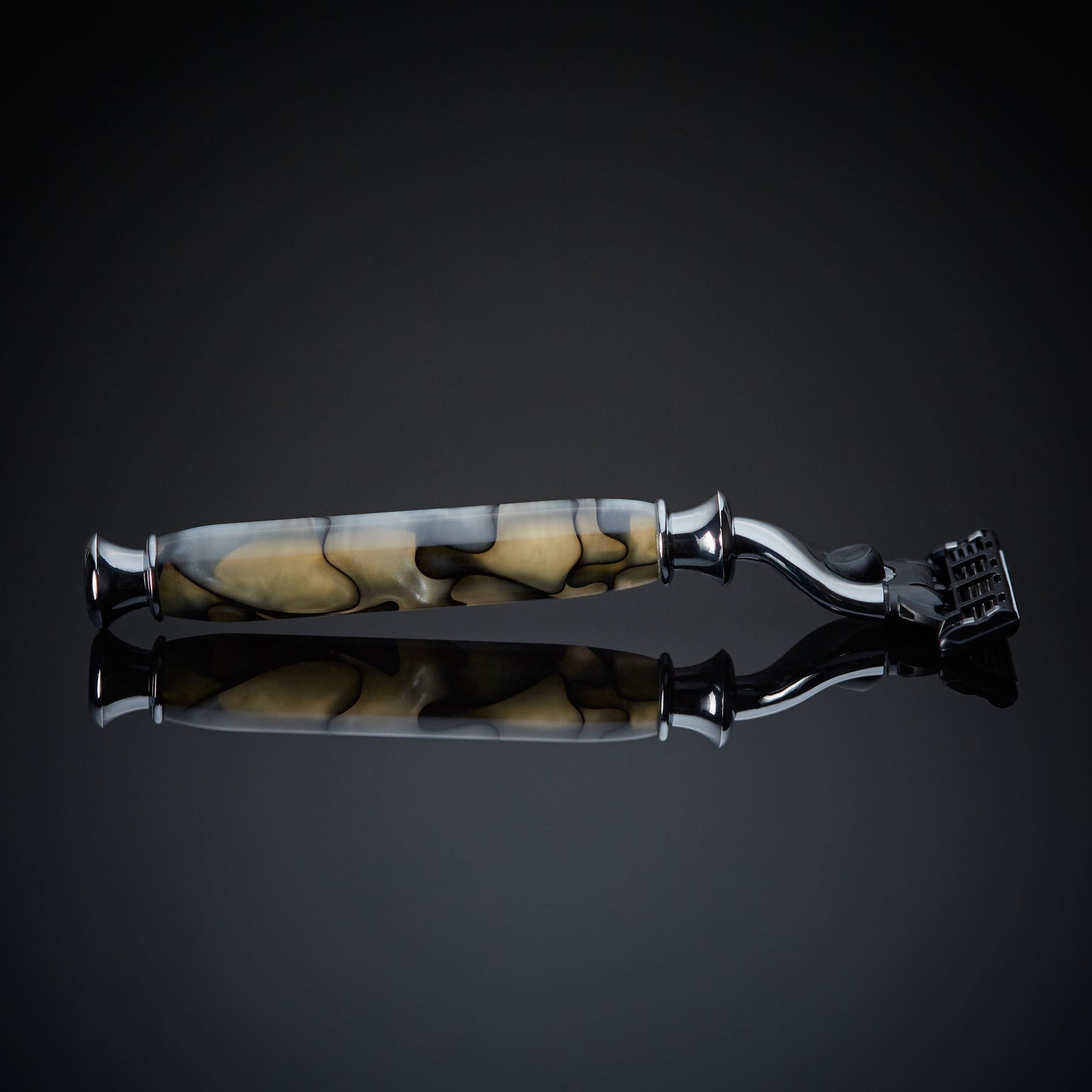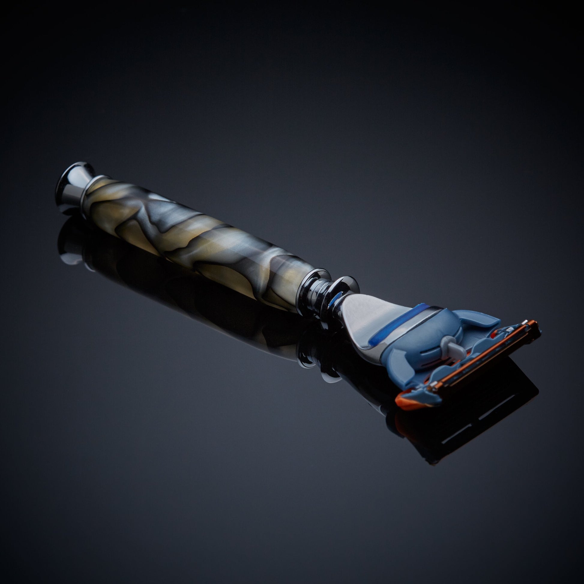 The Shadow Razor blends refinement and artistry in a striking hand-mixed resin handle. Swirls of deep black drift across an opaque golden white base, evoking the look of shadows rising in crisp winter air. Each pattern is naturally unique, making every razor one of a kind.