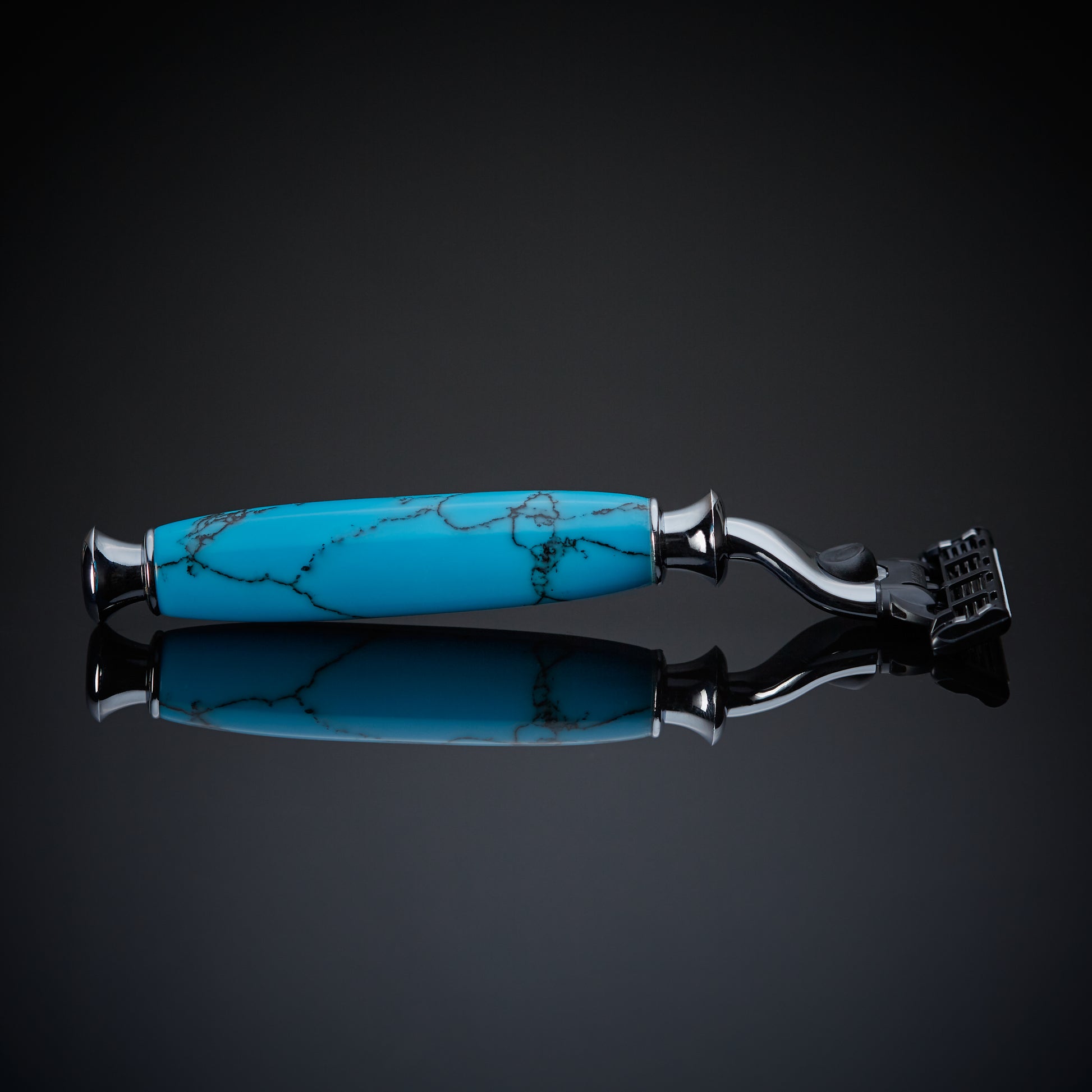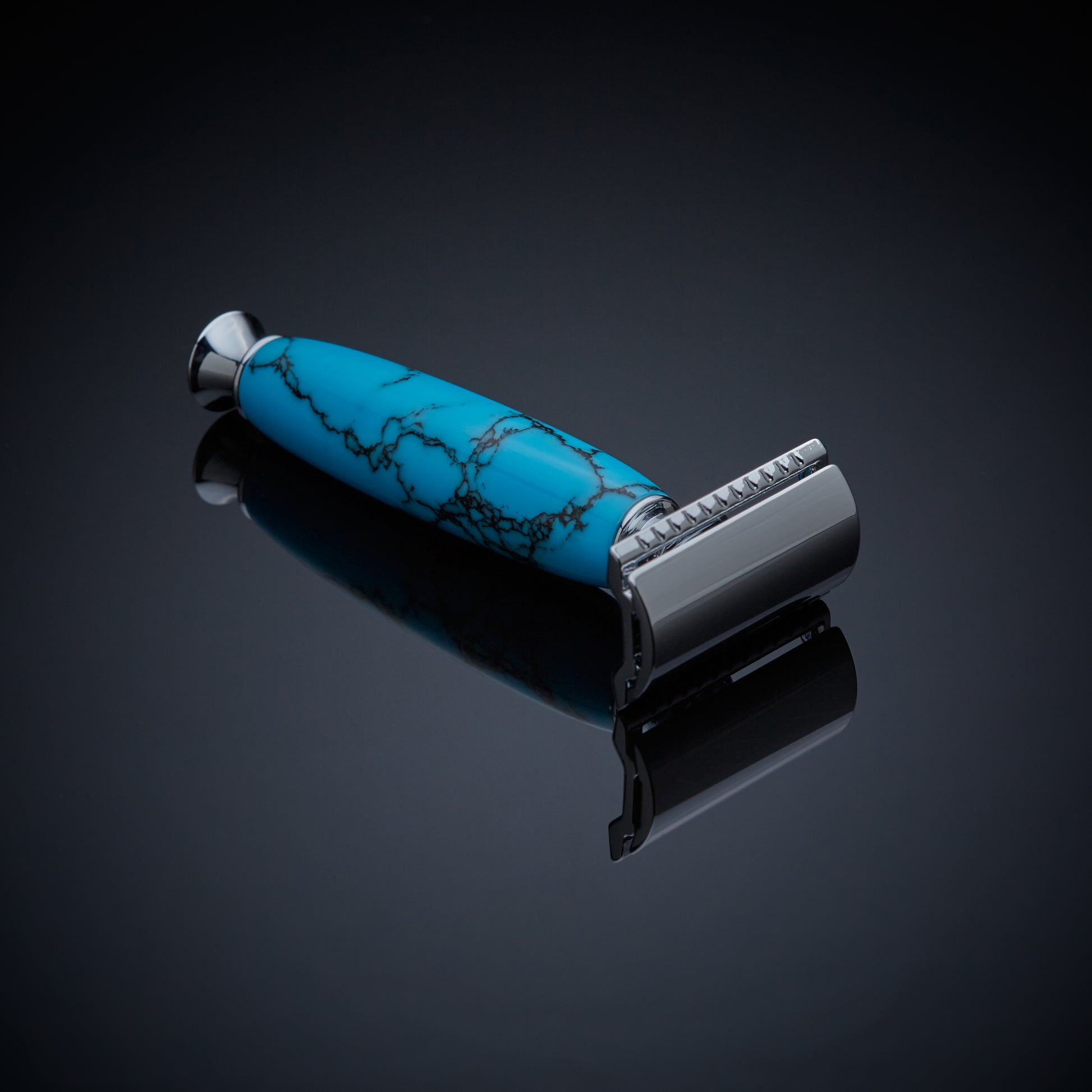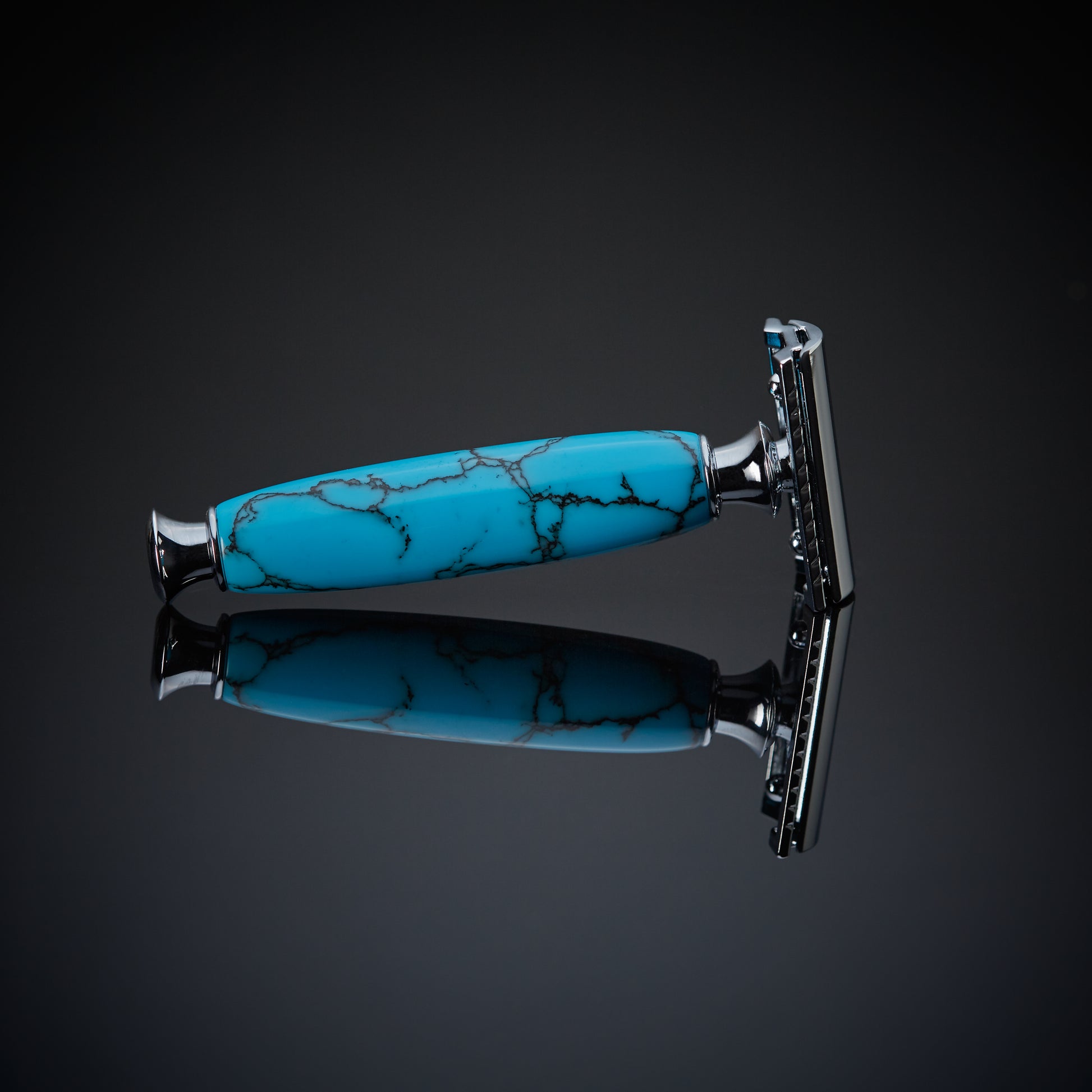 The Sedona Razor is a stunning fusion of artistry and performance, handcrafted from brilliant turquoise stone sourced in Arizona. Each handle showcases vibrant marbling in shades of turquoise blue, ensuring that no two razors are ever alike.