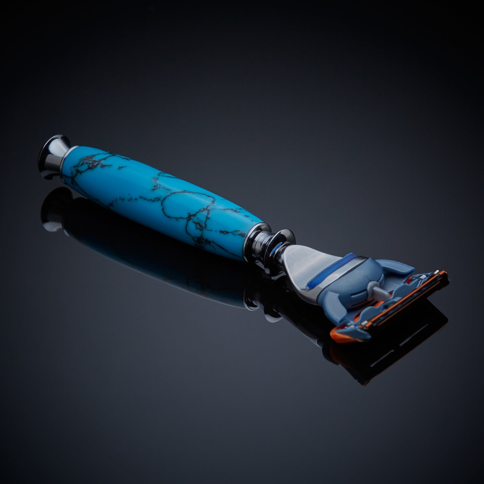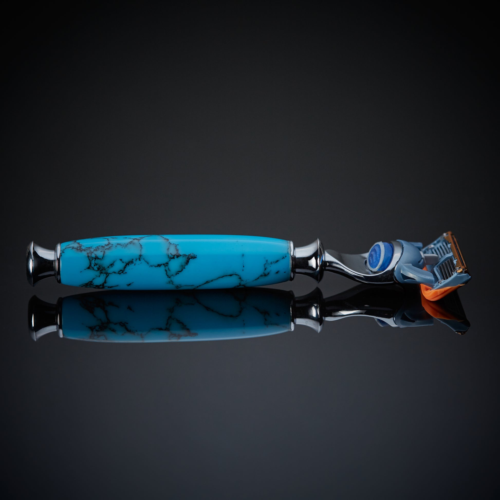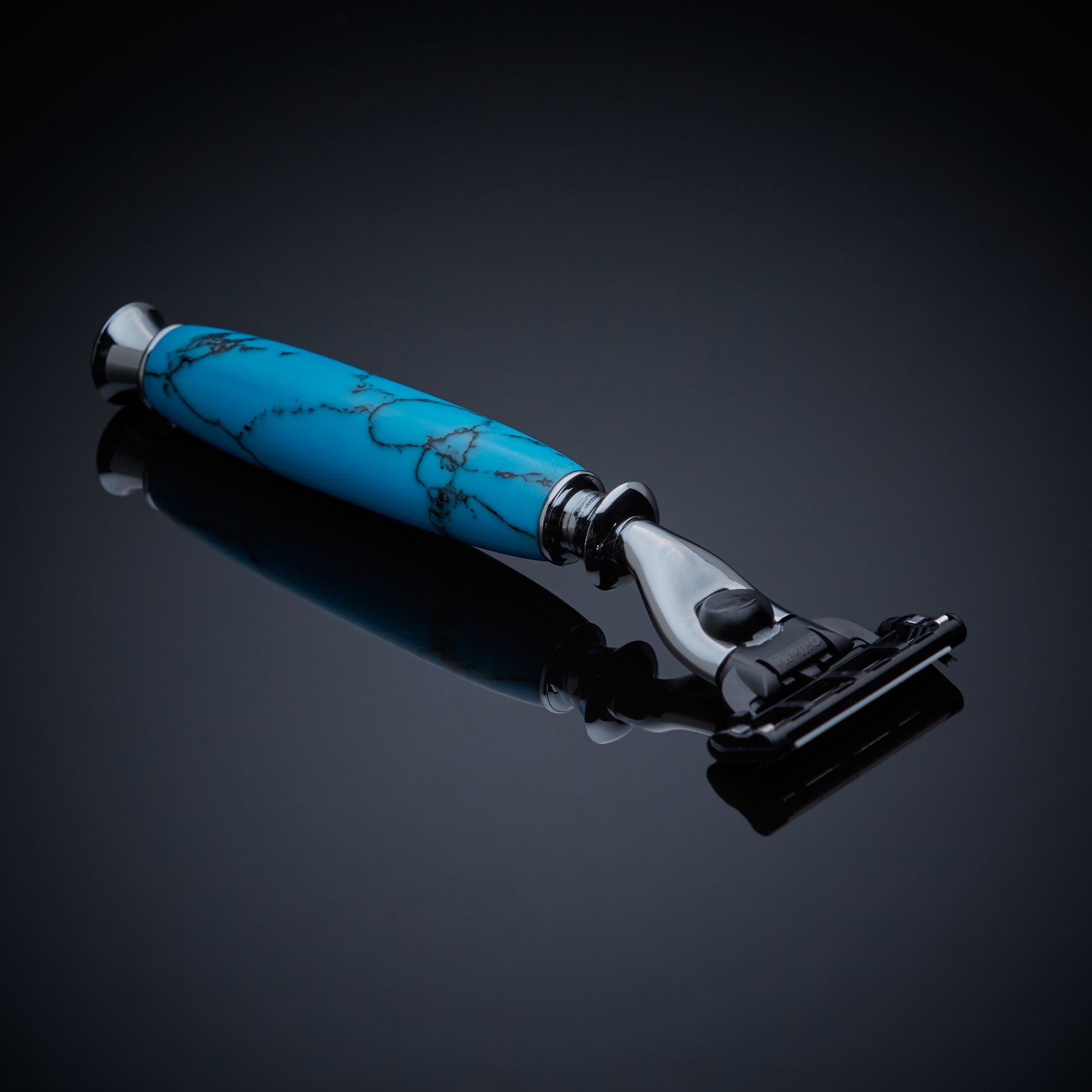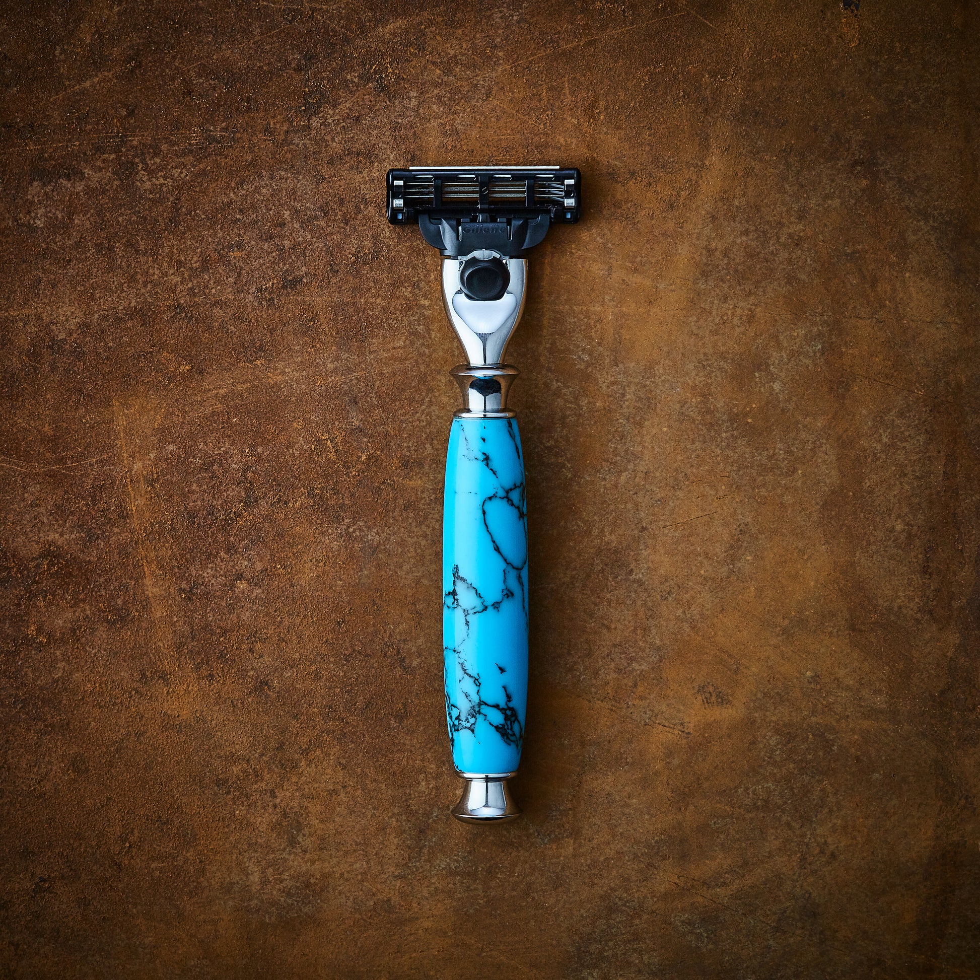 The Sedona Razor is a stunning fusion of artistry and performance, handcrafted from brilliant turquoise stone sourced in Arizona. Each handle showcases vibrant marbling in shades of turquoise blue, ensuring that no two razors are ever alike.