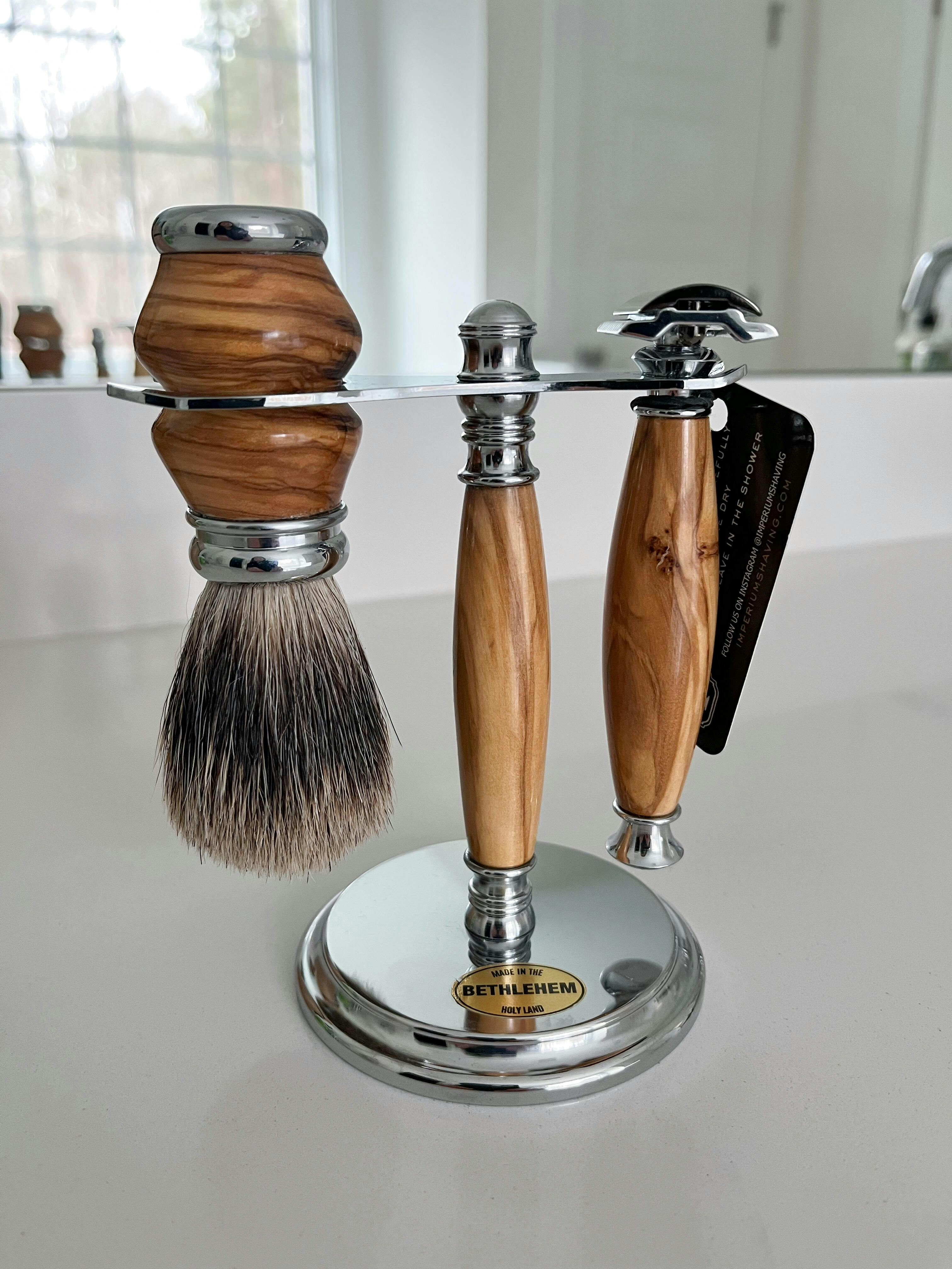 The Atlas Olivewood Brush Shaving Set blends timeless tradition with modern craftsmanship. Handcrafted from living olivewood trees near Jerusalem — some dating back over 2,000 years — each piece carries a unique grain and heritage. The matching razor, stand, and brush are carefully designed to bring both elegance and performance to your daily ritual.