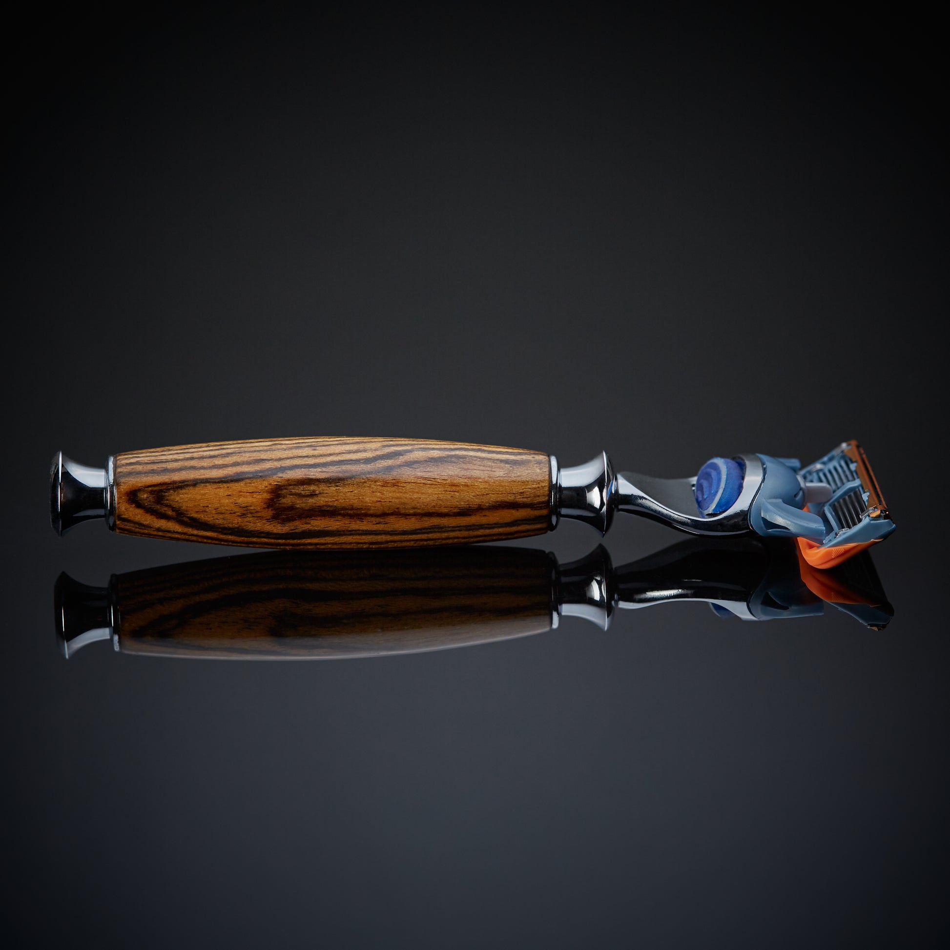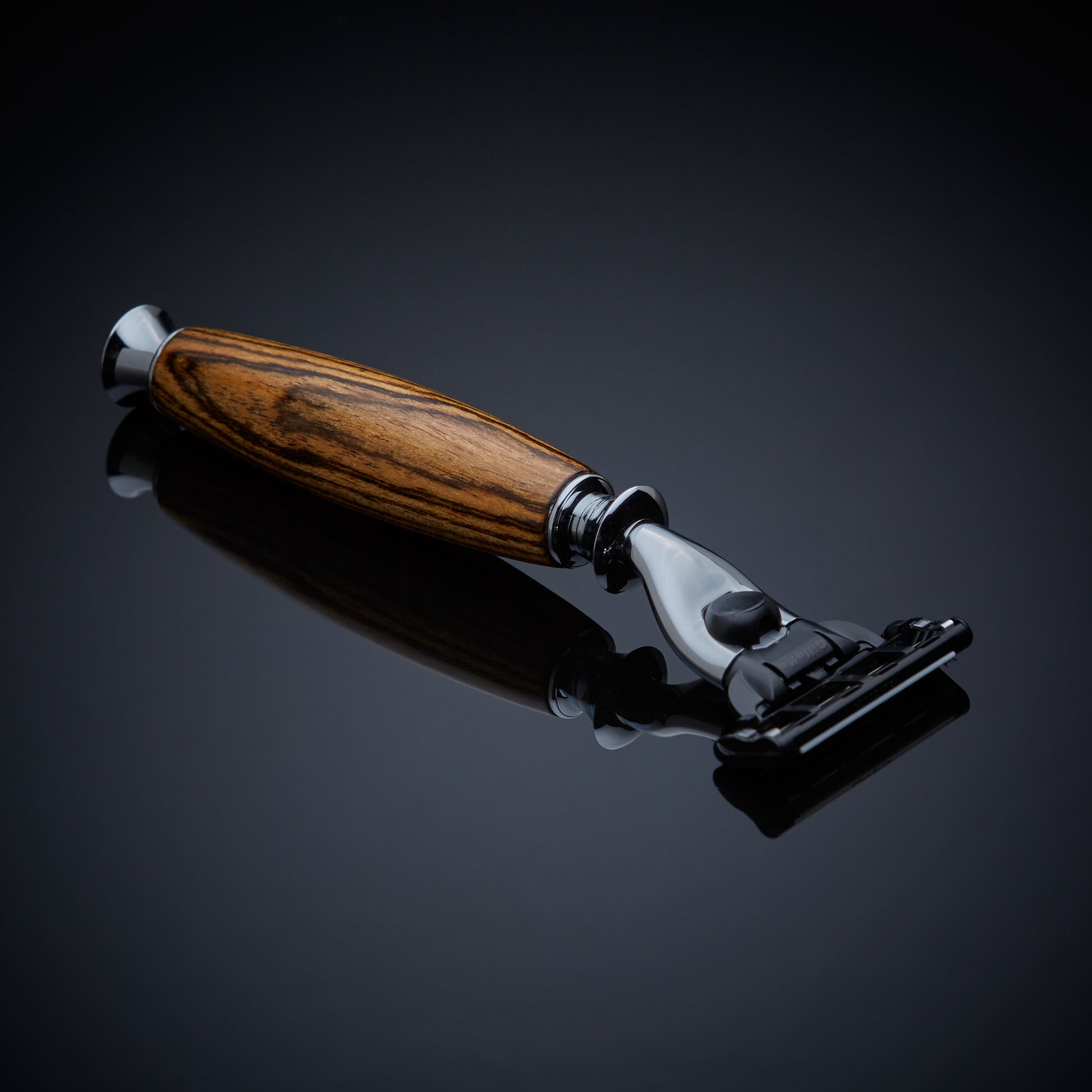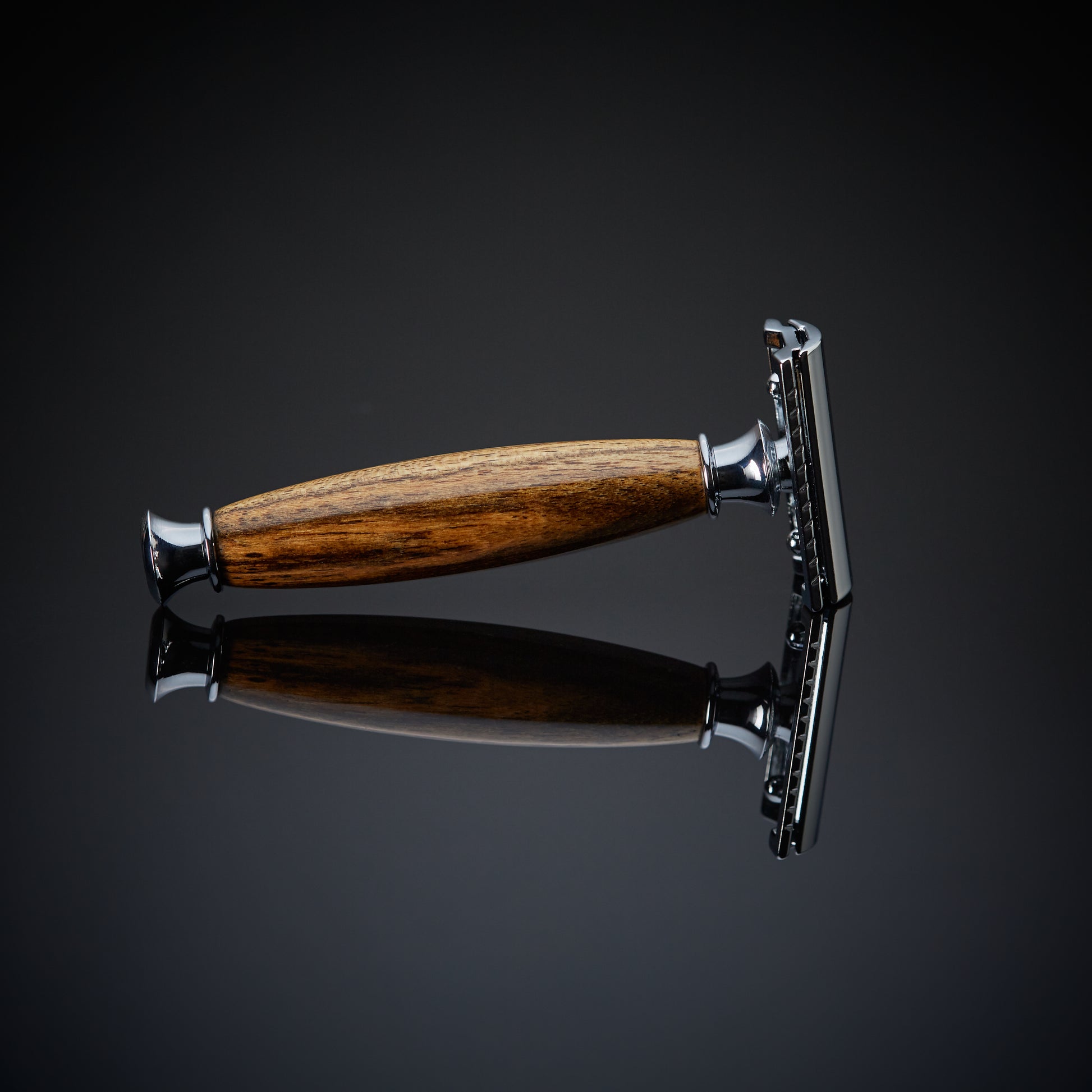 The Rio Razor is a bold expression of craftsmanship and natural beauty. Handcrafted from Tigerwood grown on sustainable tree farms throughout Central and South America, each razor displays striking grain patterns that make every piece unique.