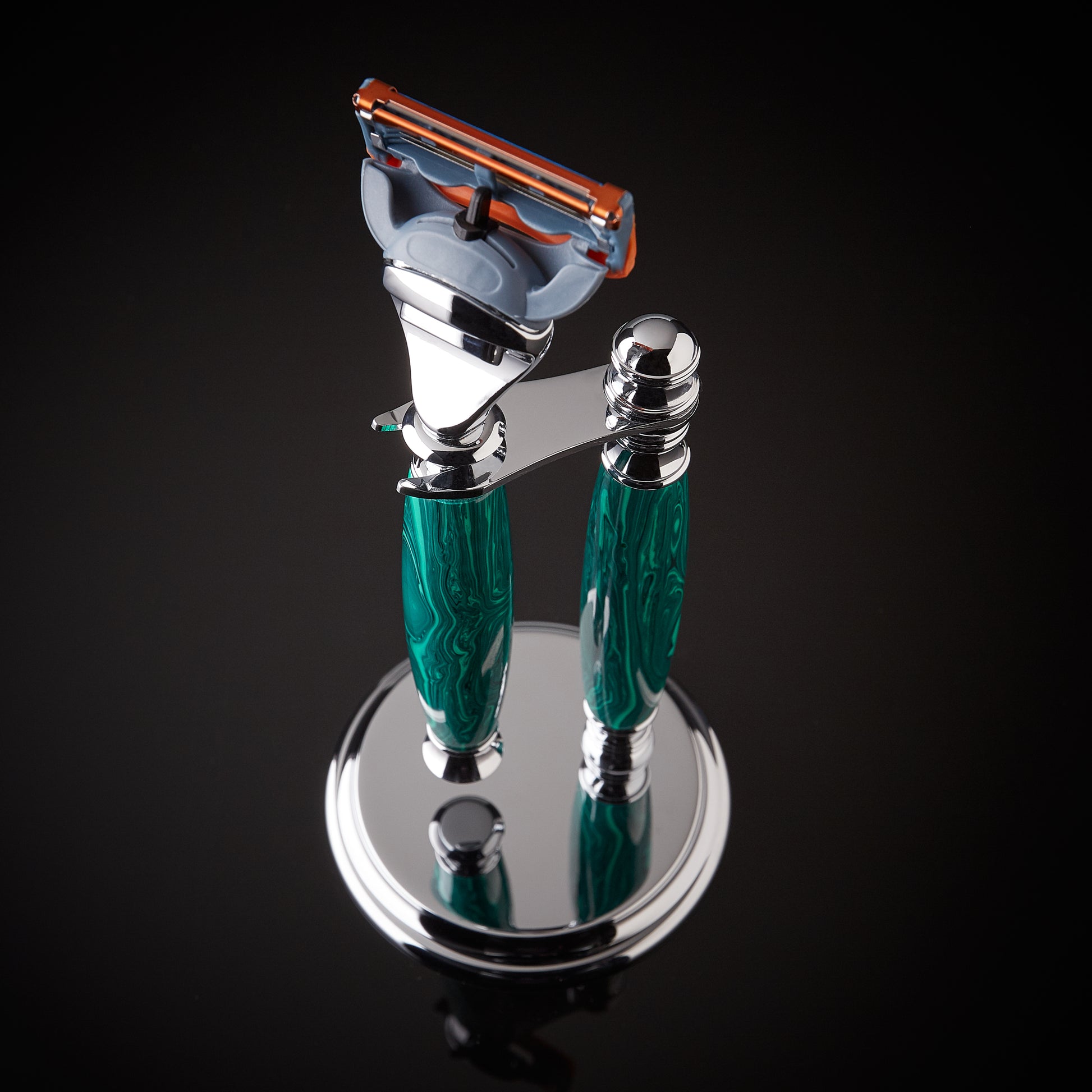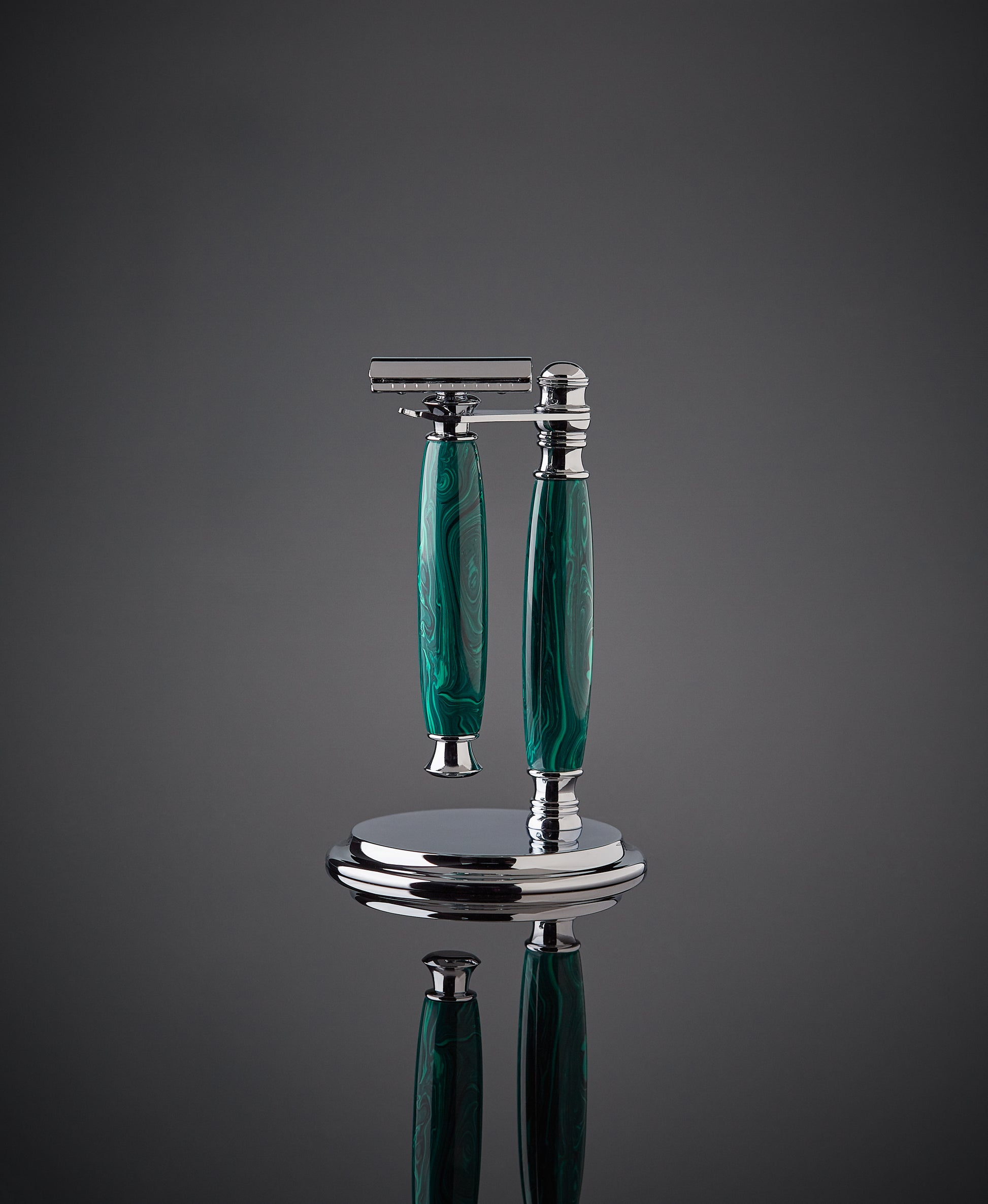The Serpentine Shave Set is a rare expression of artistry and refinement, handcrafted from green-banded Malachite gemstone. Each piece radiates an unmistakable elegance, with naturally unique striations that make every razor and stand truly one of a kind.