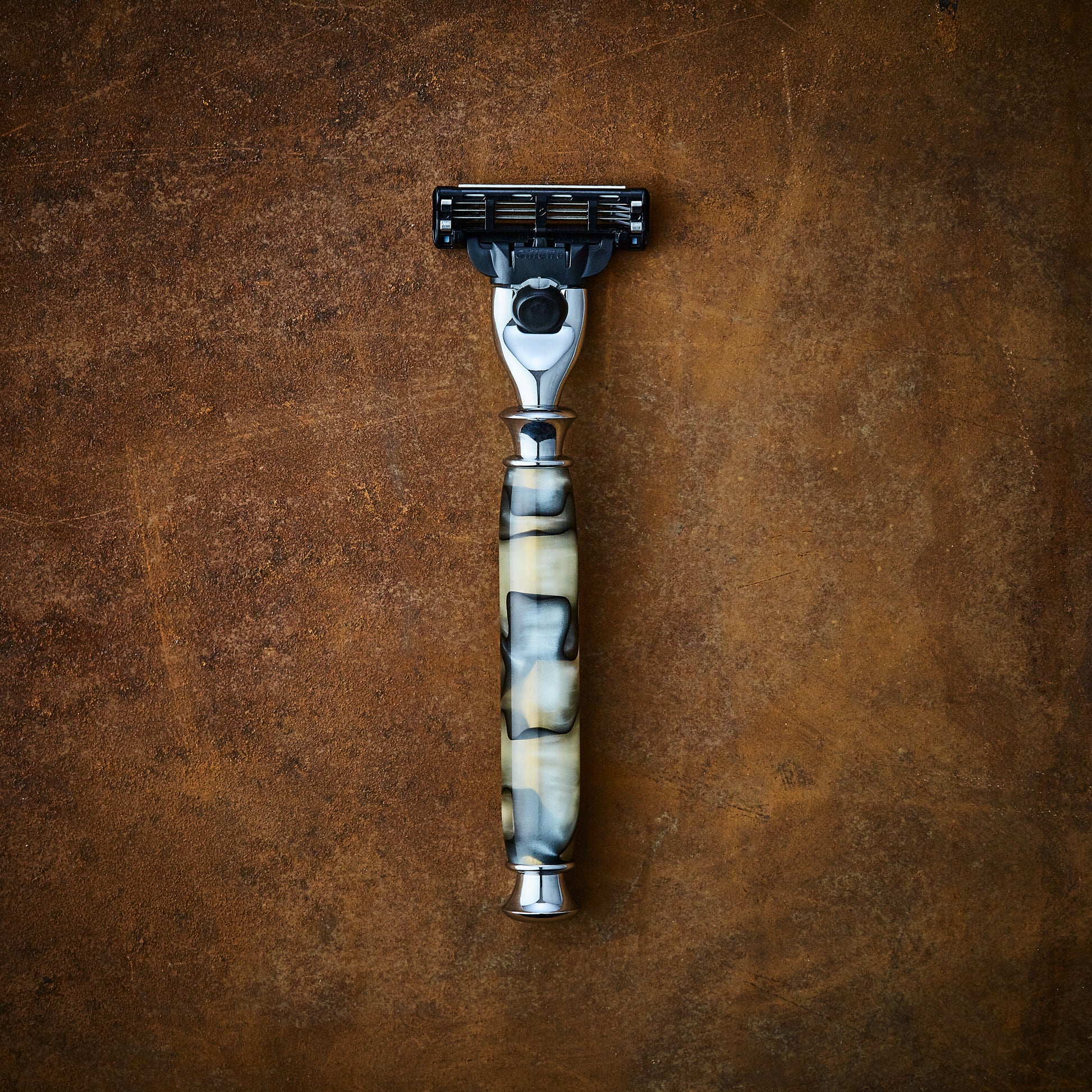 Our Shadow line of razors is handcrafted from precious resin with black ribbons swirled over an opaque golden white, like a shadow rising in the still winter air. Available for Gillette blades. This is the quintessential high-end shaving tool that perfectly embodies handcrafted luxury and classic men's grooming.